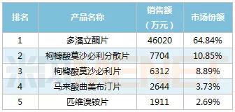 值得一提的是,在中国城市实体药店终端,多潘立酮片是胃肠解痉药、抗胆碱药和胃动力药市场的TOP1品种,销售额长期遥遥领先,2020年占据近65%的市场份额。