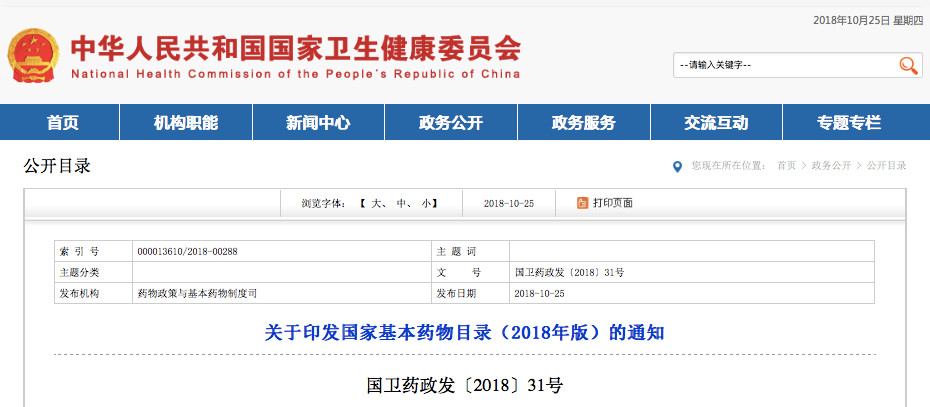 10月25日,国家卫健委正式发布《国家基本药物目录(2018年版)》,目录将于11月1日起在全国正式实施。